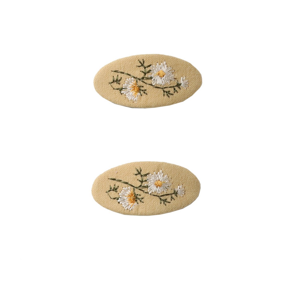 Onze Myrtle-haarspeldset is een eerbetoon aan vervlogen tijden. Het bovenste deel van de sluiting is volledig ingebed in zachte stof met betoverend nostalgisch bloemenborduurwerk. Een trouwe metgezel, zowel in het dagelijks leven als op vakantie.