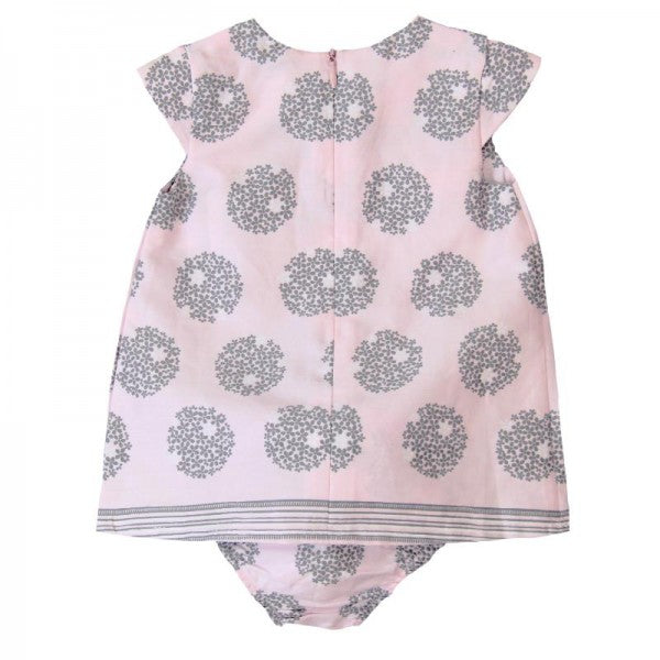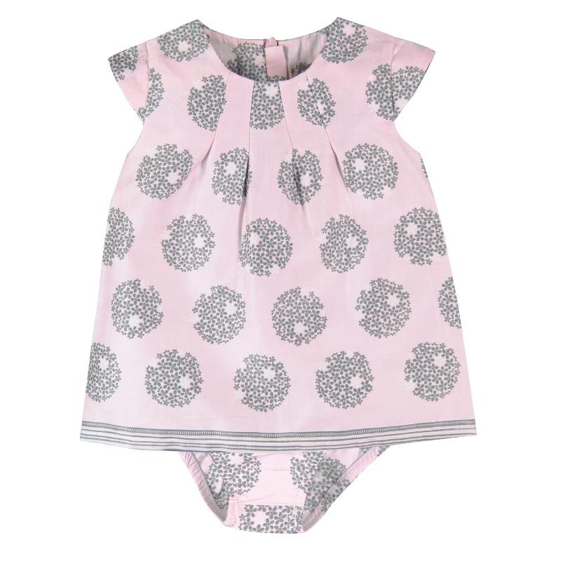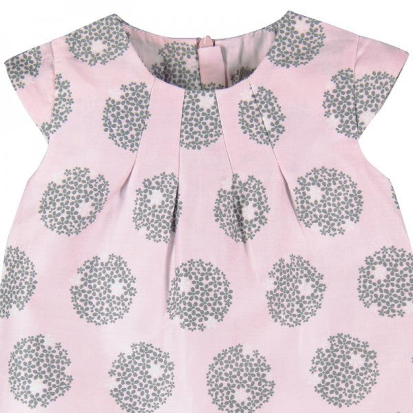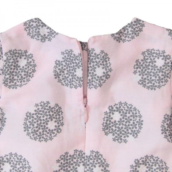 vestido de niña de satén en color rosa con estampado redondeles en color gris, se cierra con cremallera.