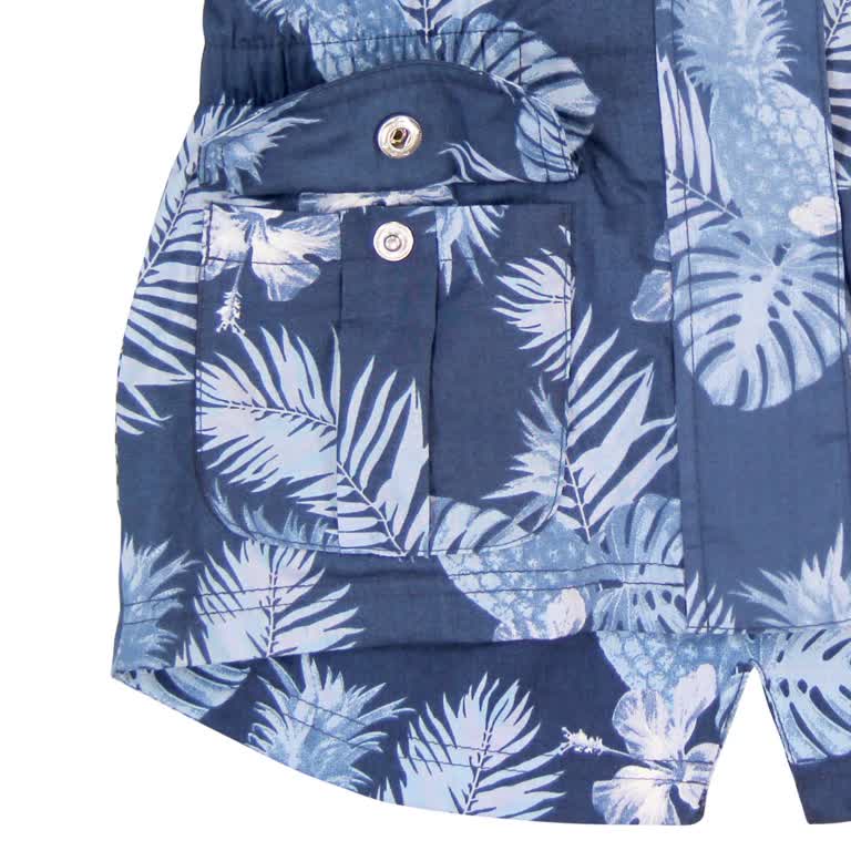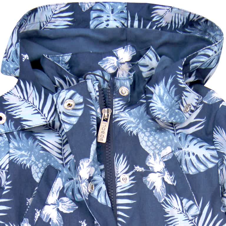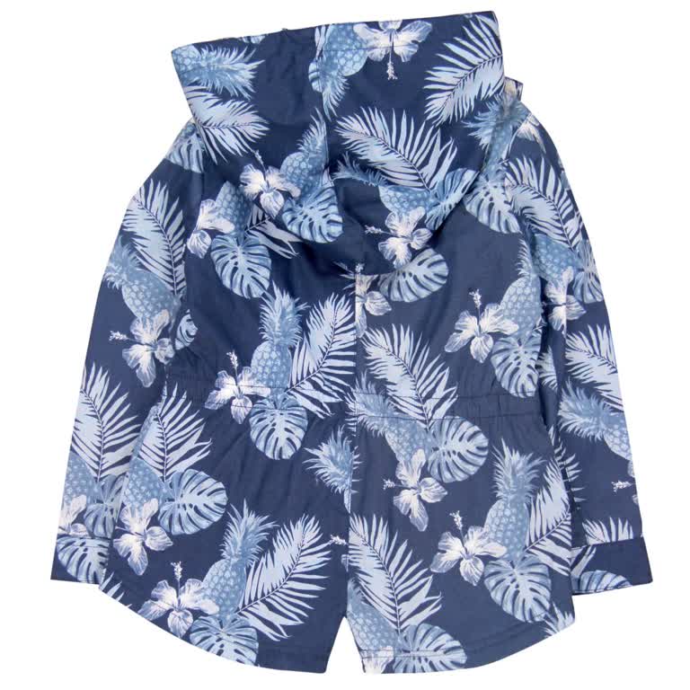Zomerjas van katoen in blauwe jungle print met ritssluiting, windvanger met drukknopen en afneembare capuchon in maat 116 cm