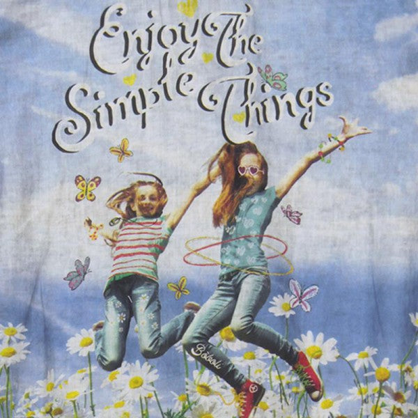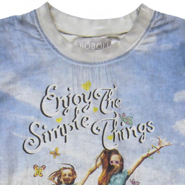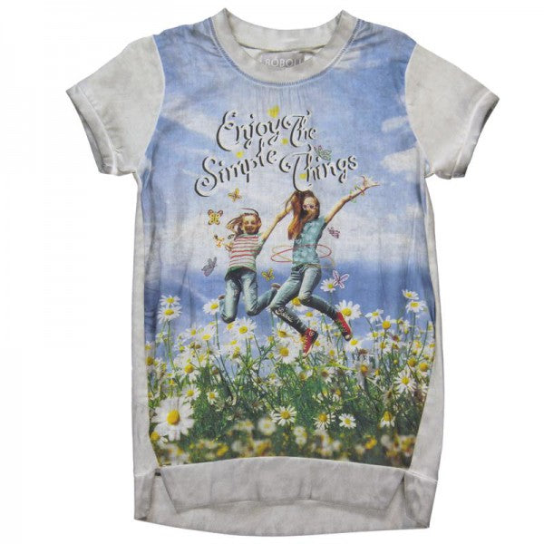 vestido de niña de punto elástico en color perla, el delantero es de raso con un gran estampado en varios colores. la prenda lleva un proceso de tintura para darle un aspecto más desgastado.