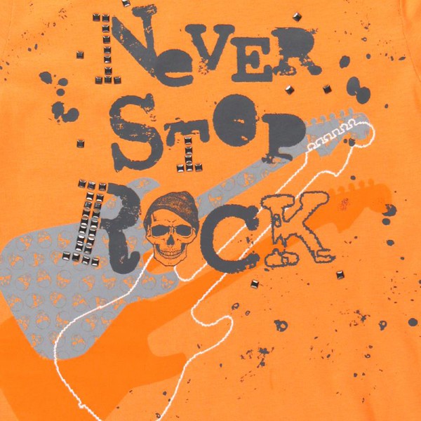 camiseta de niño de punto en color mango, el tapacosturas del cuello es de color cyan, la decoración es un gran estampado en varios colores.