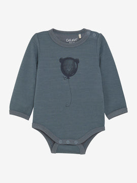 Body met lange mouwen van CeLaVi. Het wordt geopend met praktische drukknopen op de schouder en tussen de benen. De body is gemaakt van een kwaliteit die zeer zacht en comfortabel aanvoelt op de huid. Het lijfje is van wol aan de buitenkant en van bamboeviscose aan de binnenkant. De body heeft een leuke print op de voorkant. Gecertificeerd volgens. volgens OEKO-TEX® STANDAARD 100 Cert. Nr. 2276-364 DTI