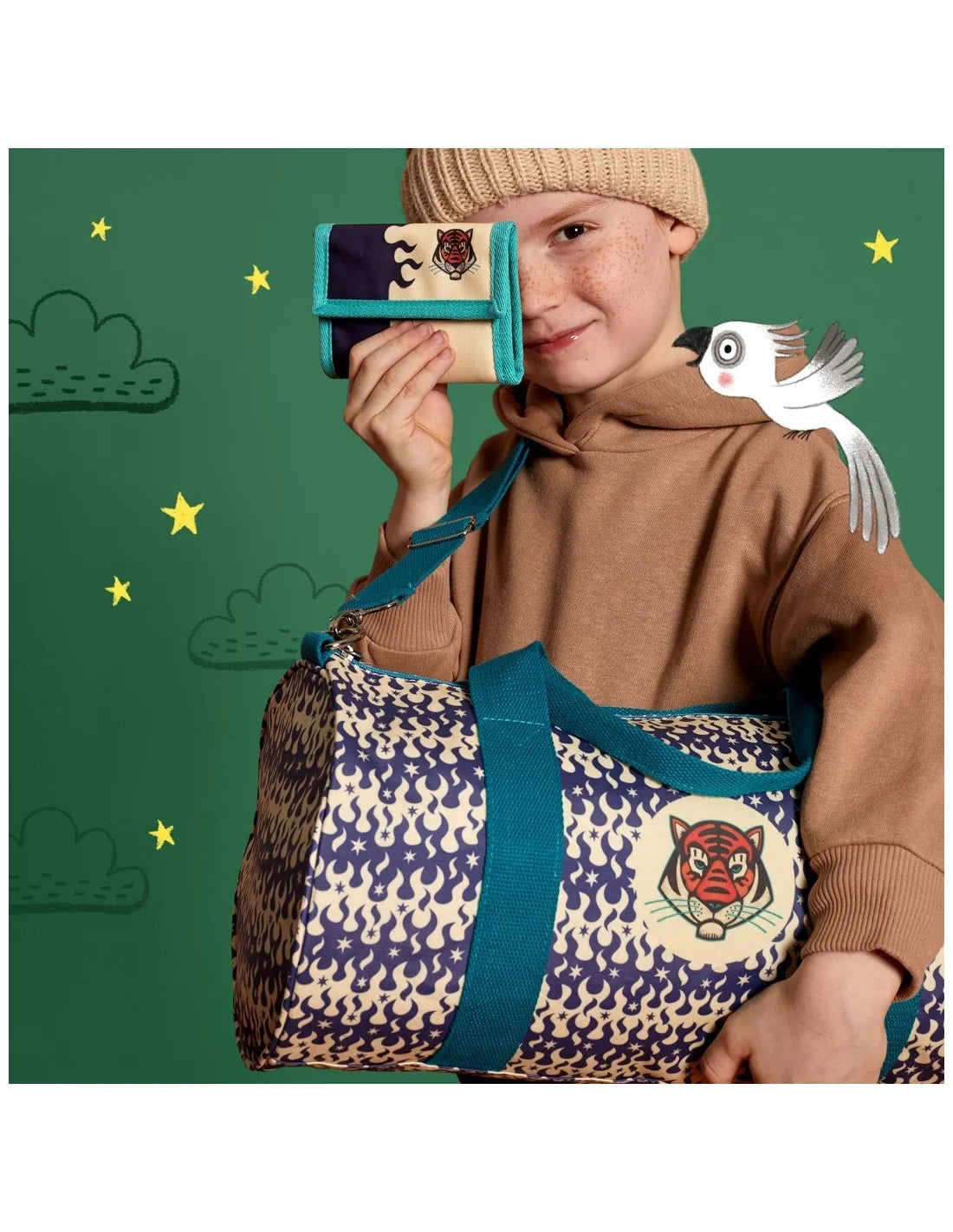 Een plunjezak met een afbeelding van een tijger, perfect om alle spulletjes in te doen voor op vakantie of een weekendje weg. Gemaakt van gecoat canvas, waardoor de inhoud niet nat wordt. De binnenkant is van textiel en heeft een klein vakje en een groot vak met ritssluiting. Het kind kan hem over zijn schouder dragen dankzij het verstelbare hengsel of vasthouden aan de 2 handgrepen.