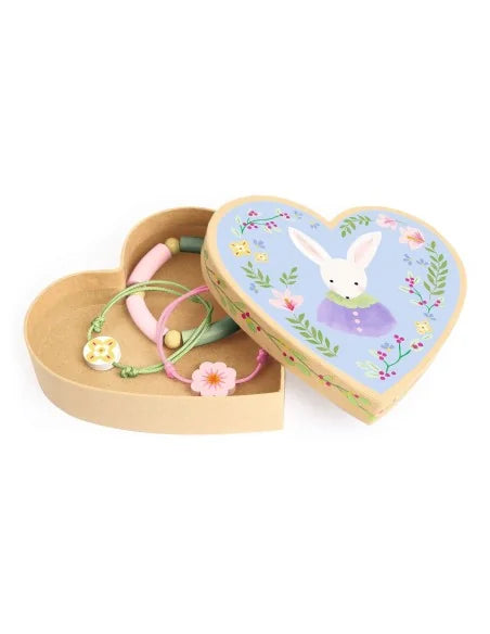 In deze mooie hartvormige doos versierd met een lief konijntje zitten 3 schattige armbanden.