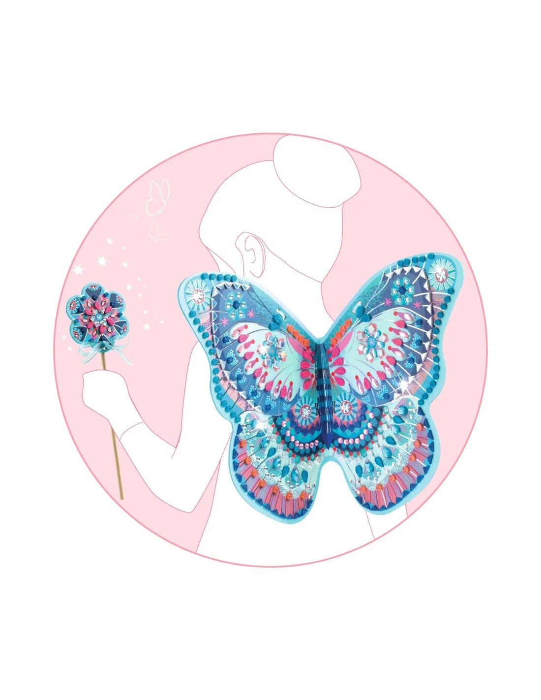 1 paar geïllustreerde vleugels van stevig karton, 2 elastische banden, 1 toverstaf, 5 vellen foamstickers met glittermozaïek, 3 vellen edelsteenstickers, 1 gebruiksaanwijzing.