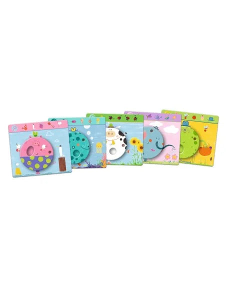 Een set met beweegbare elementen om mee te spelen, 6 platen met een wiel dat kan draaien en een instructieboekje