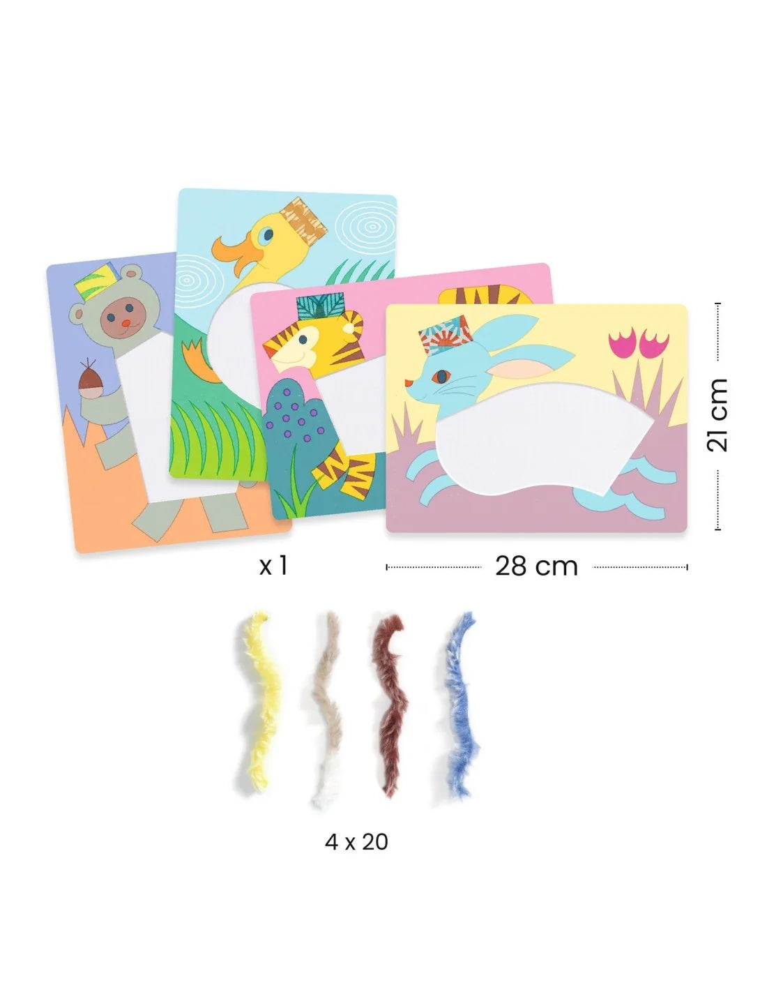 Een activiteit zo zacht als een knuffel! Het kind plaatst de draadjes zachte wol op het Velcro®-klittenband om schattige diertjes te maken. Een perfecte activiteit voor kinderen van 3 tot 6 jaar, die zachtheid, creativiteit en fijne motoriek