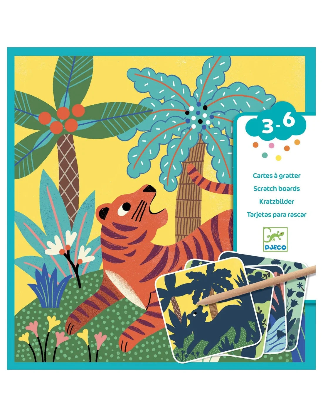 4 krasplaten, te krassen met een pen met ronde punt, geschikt voor kleine kinderen. Met behulp van de houten pen en het instructieboekje krassen de kinderen over het oppervlak van de kaart om tekeningen te maken of verrassingen te ontdekken, wat een plezier! En zelfs als de kinderen in hun enthousiasme alles willen wegkrassen, is het resultaat mooi.