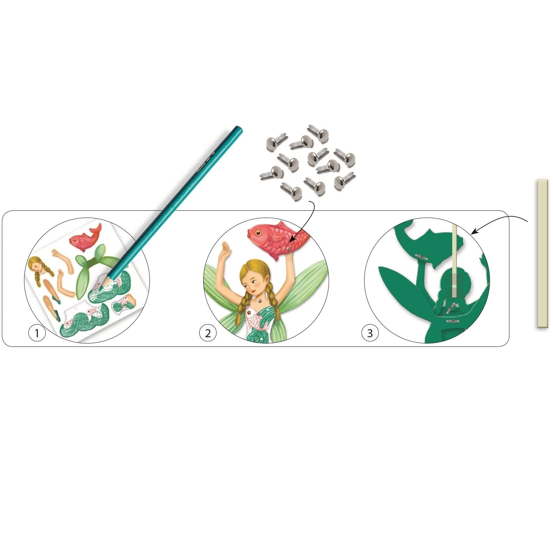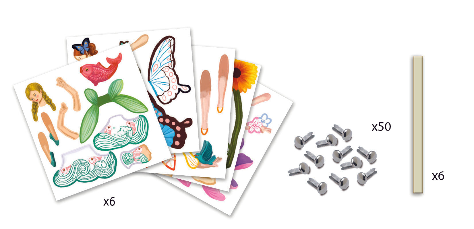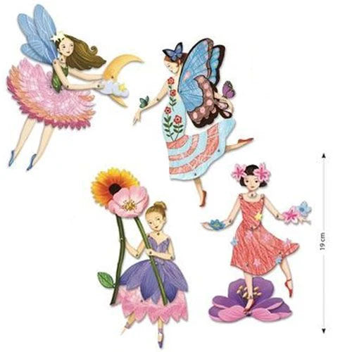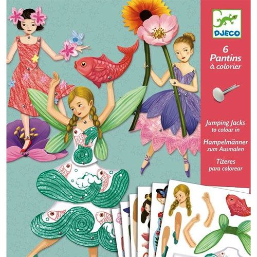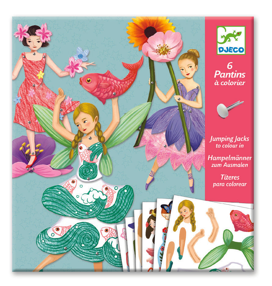Djeco Jumping Jacks FEEËN. Wat een geweldig knutselplezier met deze schattige feeën. Kleur de losse onderdelen in, zet ze in elkaar en maak ze vast met een messing sluiting. Zo schattig! De set bevat onderdelen om zes schattige feeën te maken. Materiaal: papier. Hoogte van de feeën: 19 cm. Afmetingen verpakking: 23 x 21,5 cm.