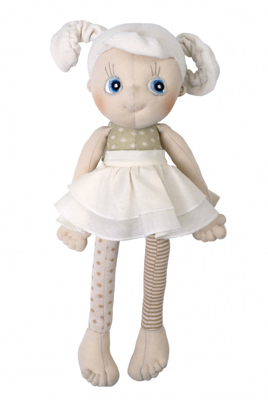 EcoBuds-pop, Daisy, vindt het heerlijk om in groene weiden rond te dwalen en de warme zomerbries langs haar roze wangen te voelen strijken. Deze pop is een zachte handgemaakte pop gemaakt van biologisch katoen. Ze gaat graag met je mee om de natuur in al haar schoonheid te ontdekken. Daisy voelt zich ook erg thuis in leuke en speelse ruimtes. Deze zachte pop is 35 cm lang, heeft een lichte huid en blond haar. Rubens Barn zijn in Zweden ontworpen, hoogwaardige en zachte handgemaakte poppen, allemaal met vrolijke unieke karakters.