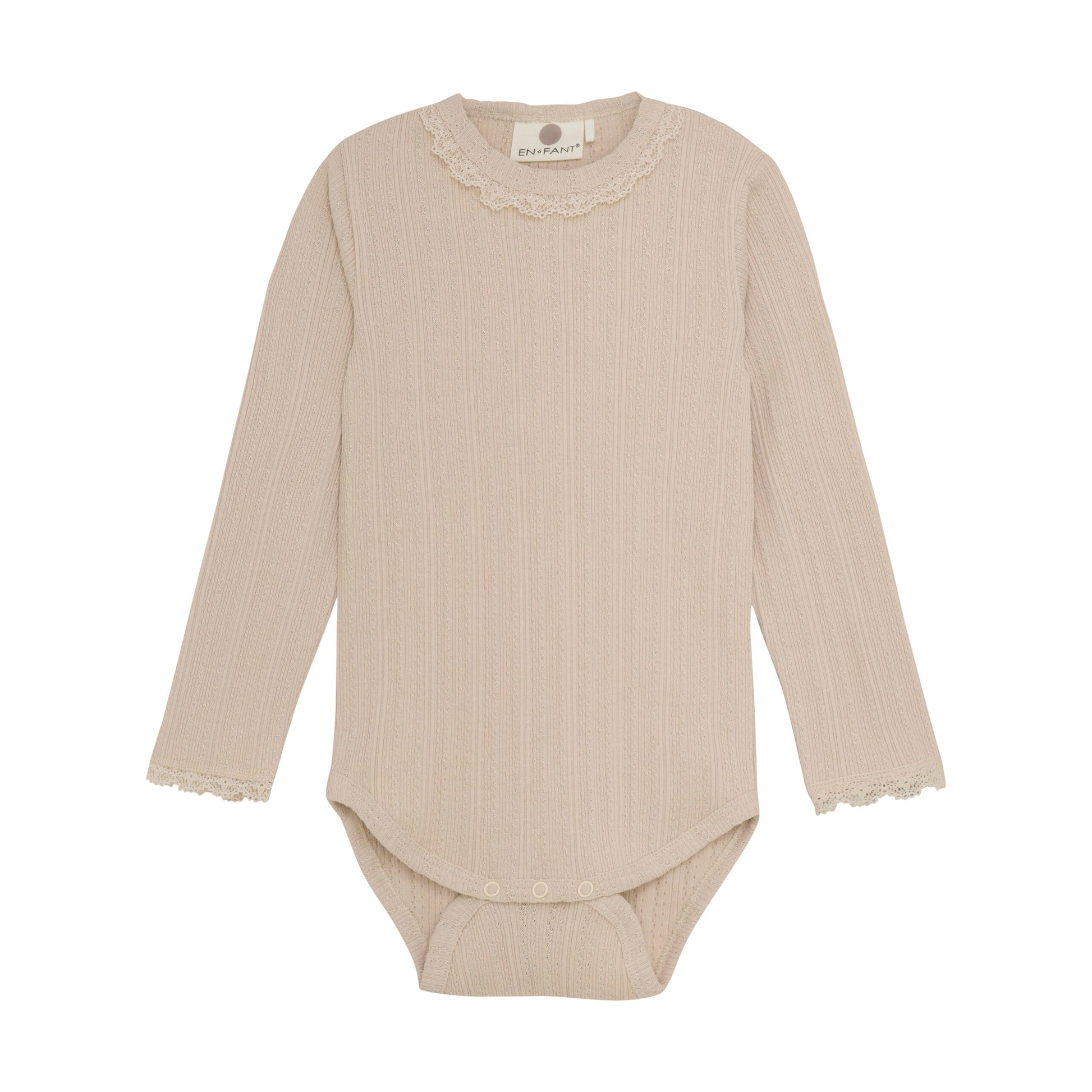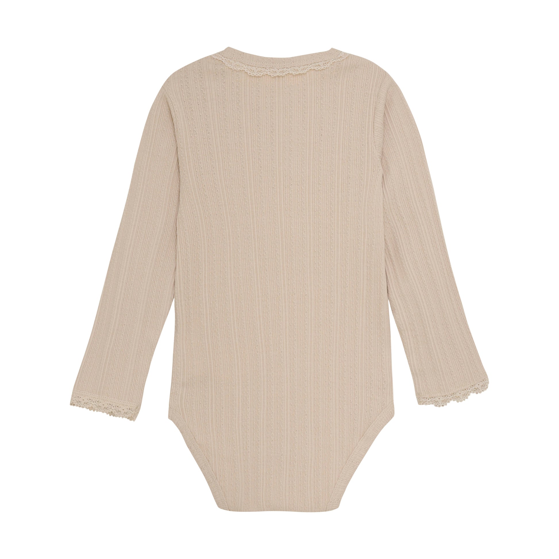 Lieflijk lijfje in een mooie pointellevorm. Het lijfje is gemaakt van een zachte katoenkwaliteit die comfortabel aanvoelt op de huid. Het heeft lange mouwen en sluit met drukknopen tussen de benen.