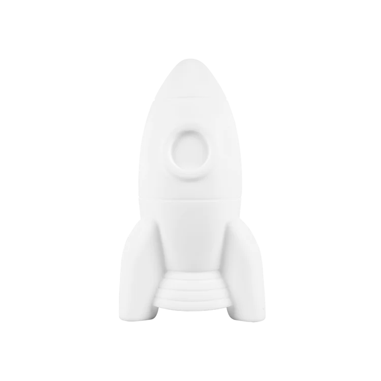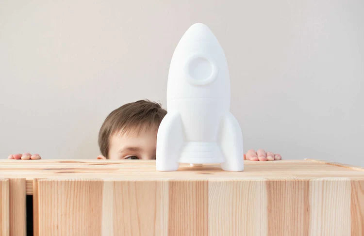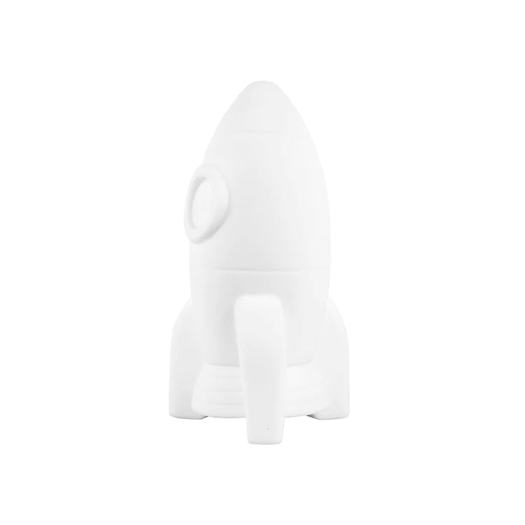 Dit leuke nachtlampje raket apollo is van een zacht materiaal zodat kindjes er veilig mee kunnen knuffelen voor ze in slaap vallen. oplaadbaar met een USB kabel en veranderd van kleur door er op te tikken. Laat de nachtlamp automatisch uitgaan na 15 minuten, of zorg er voor dat deze de hele nacht aan blijft. Beide opties zijn mogelijk met de aan-/ uitknop op de onderkant.
