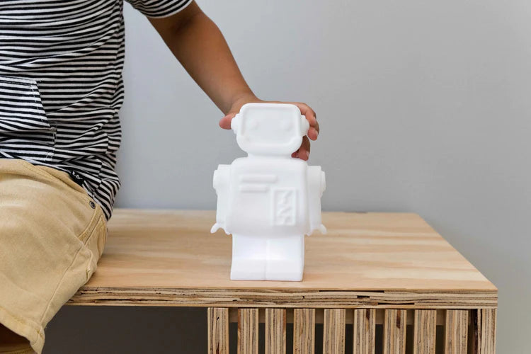 Dit leuke nachtlampje robot Hero is van een zacht materiaal zodat kindjes er veilig mee kunnen knuffelen voor ze in slaap vallen. oplaadbaar met een USB kabel en veranderd van kleur door er op te tikken. Laat de nachtlamp automatisch uitgaan na 15 minuten, of zorg er voor dat deze de hele nacht aan blijft. Beide opties zijn mogelijk met de aan-/ uitknop op de onderkant.