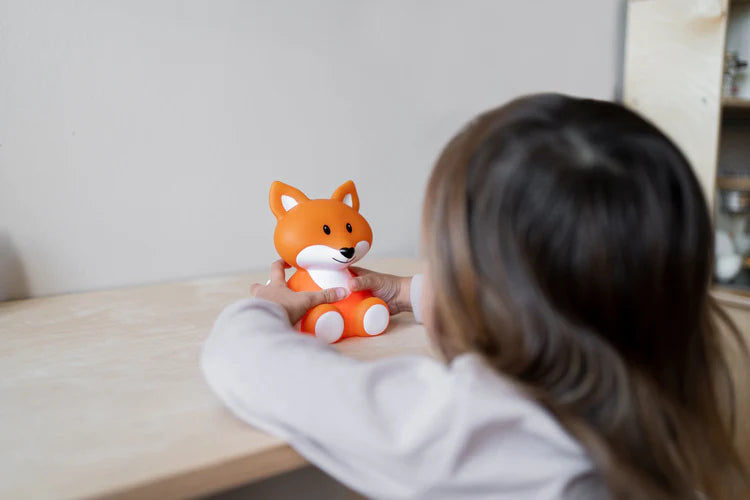 Dit leuke nachtlampje vosje Robin is van een zacht materiaal zodat kindjes er veilig mee kunnen knuffelen voor ze in slaap vallen. oplaadbaar met een USB kabel en veranderd van kleur door er op te tikken. Laat de nachtlamp automatisch uitgaan na 15 minuten, of zorg er voor dat deze de hele nacht aan blijft. Beide opties zijn mogelijk met de aan-/ uitknop op de onderkant.