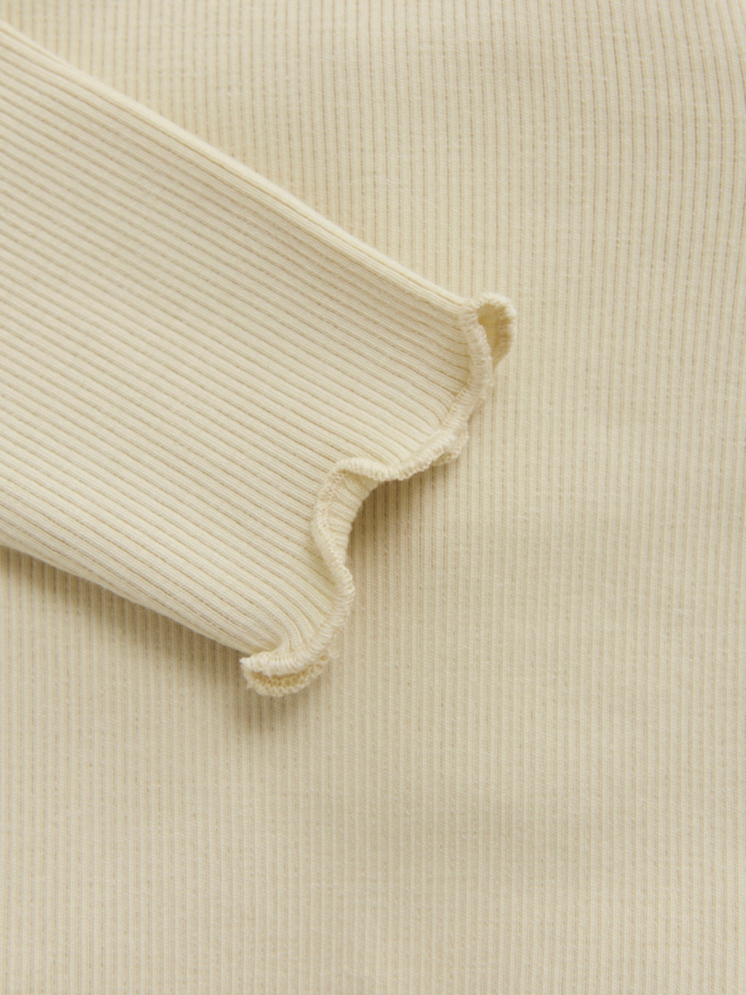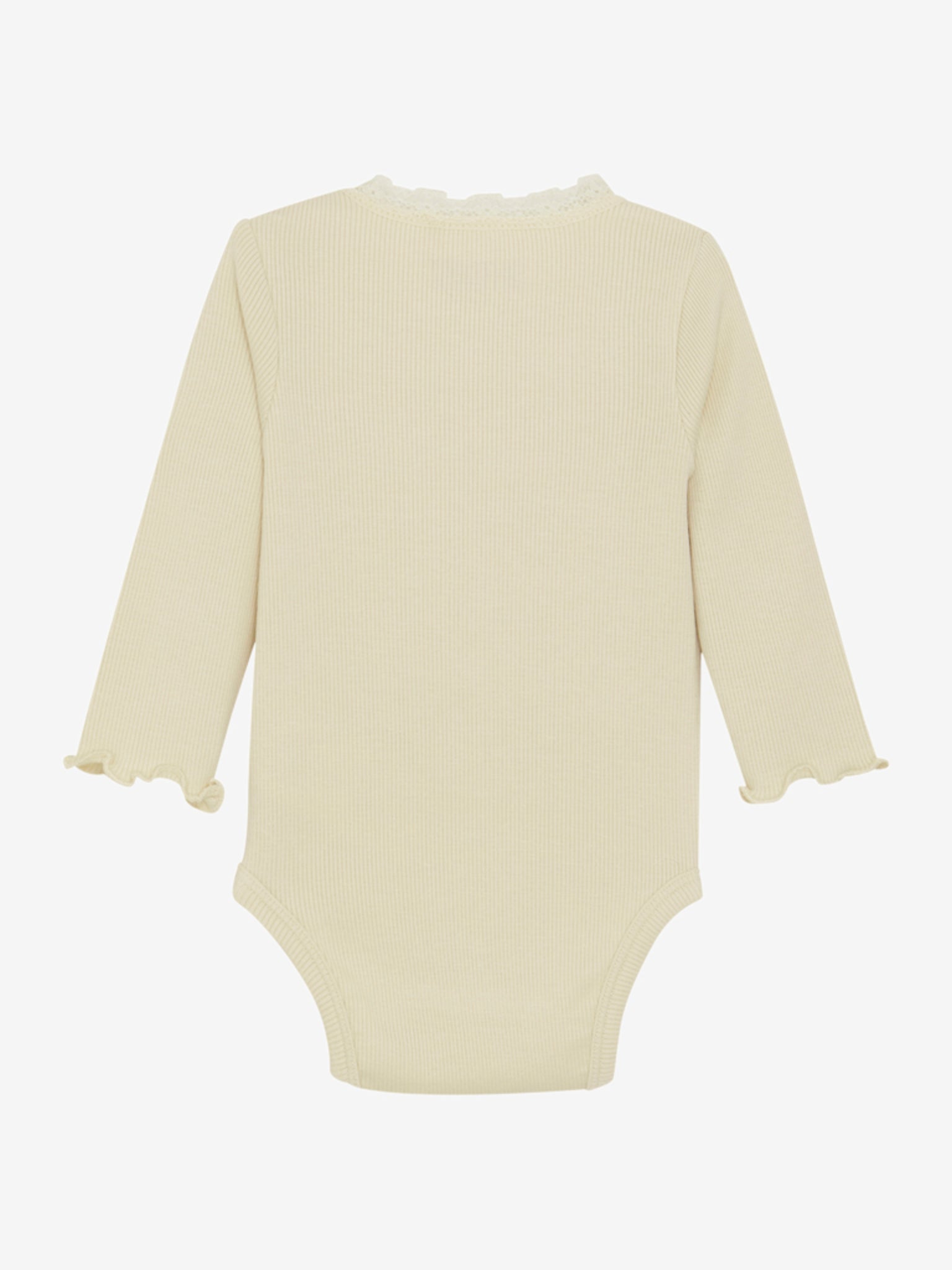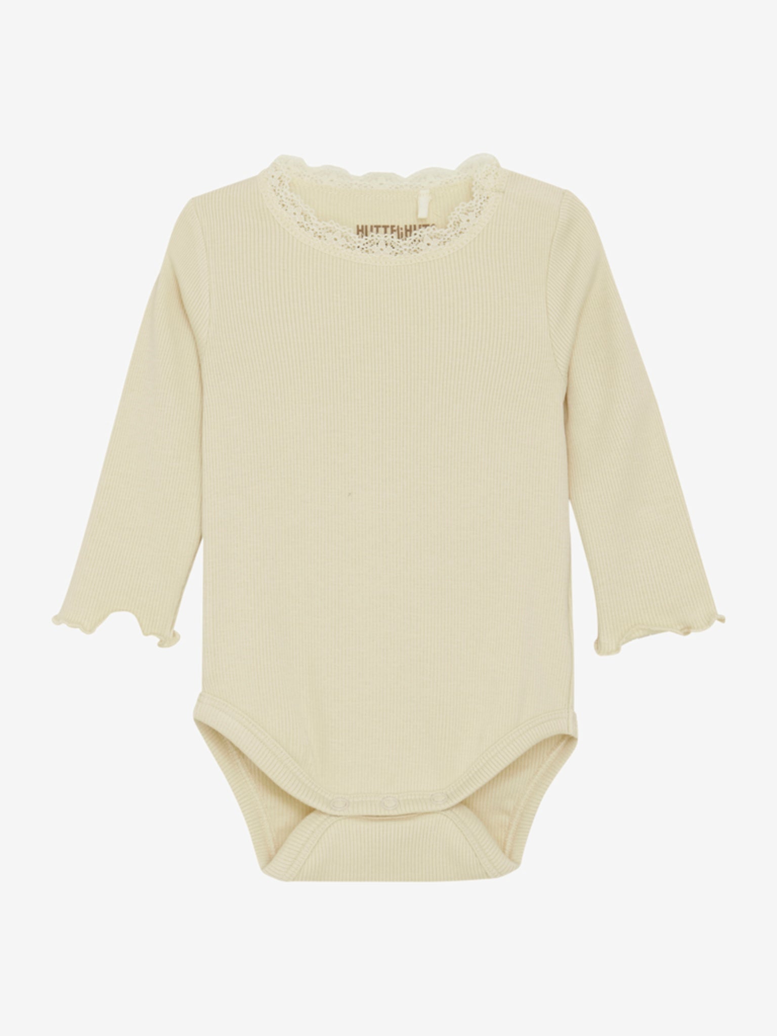 Effenkleurige bodysuit van Huttelihut met kanten rand in de nekopening. Het heeft lange mouwen met fijne golvende randen in de mouwopening. Het opent met praktische drukknopen op de linkerschouder en tussen de benen. Het lichaam is in een zachte modale kwaliteit. Dit product bevat TENCEL™-vezels. TENCEL™ is een handelsmerk van Lenzing AG