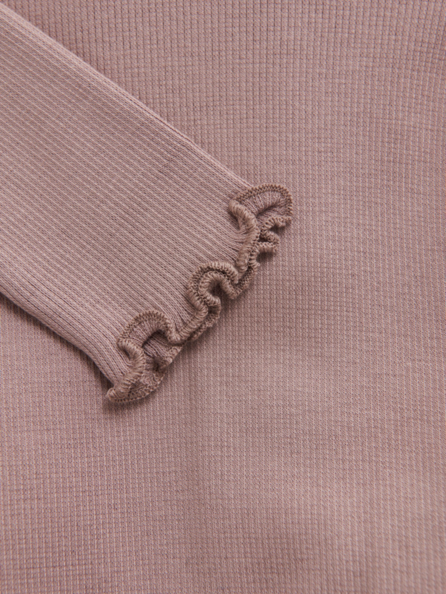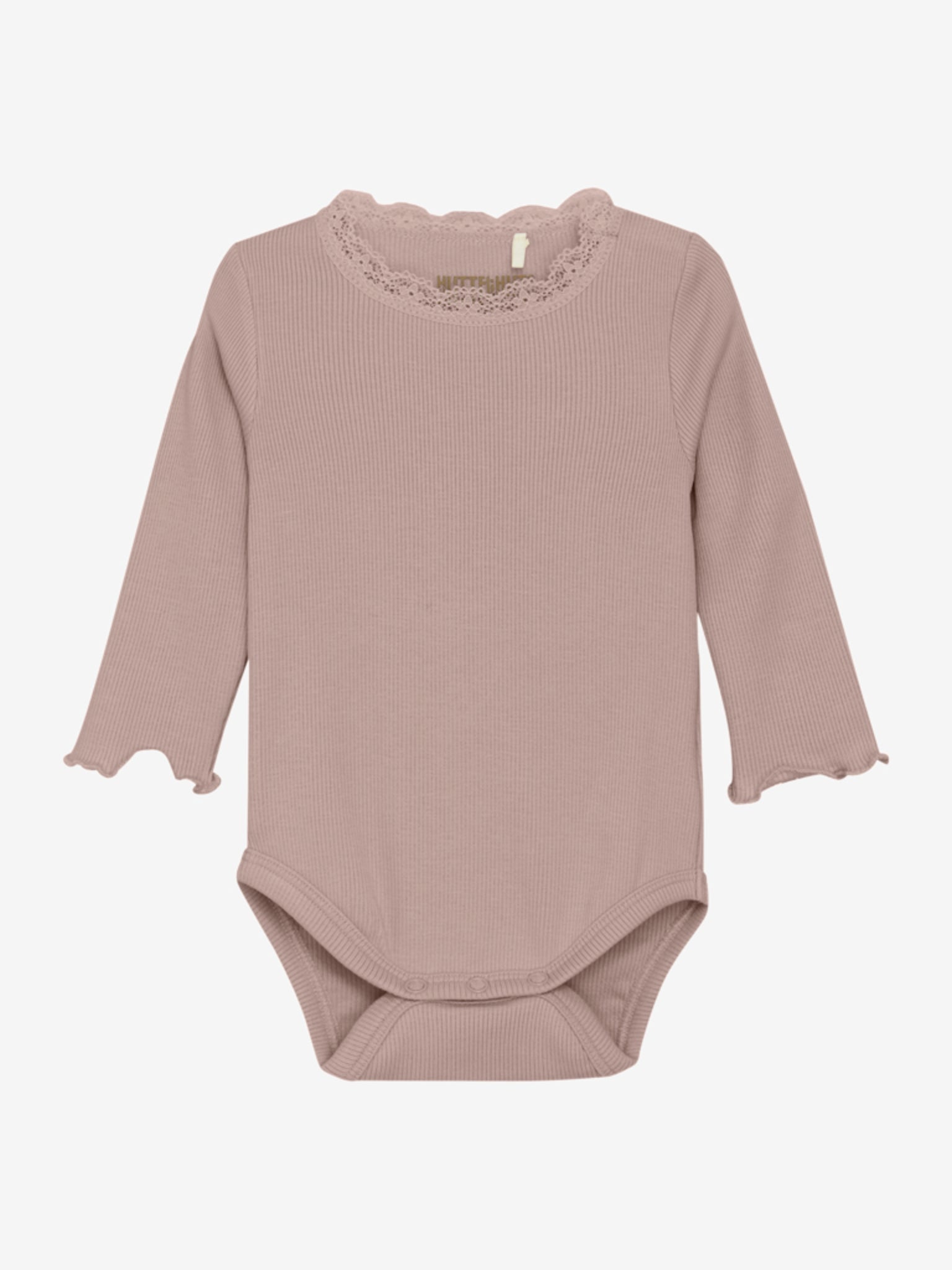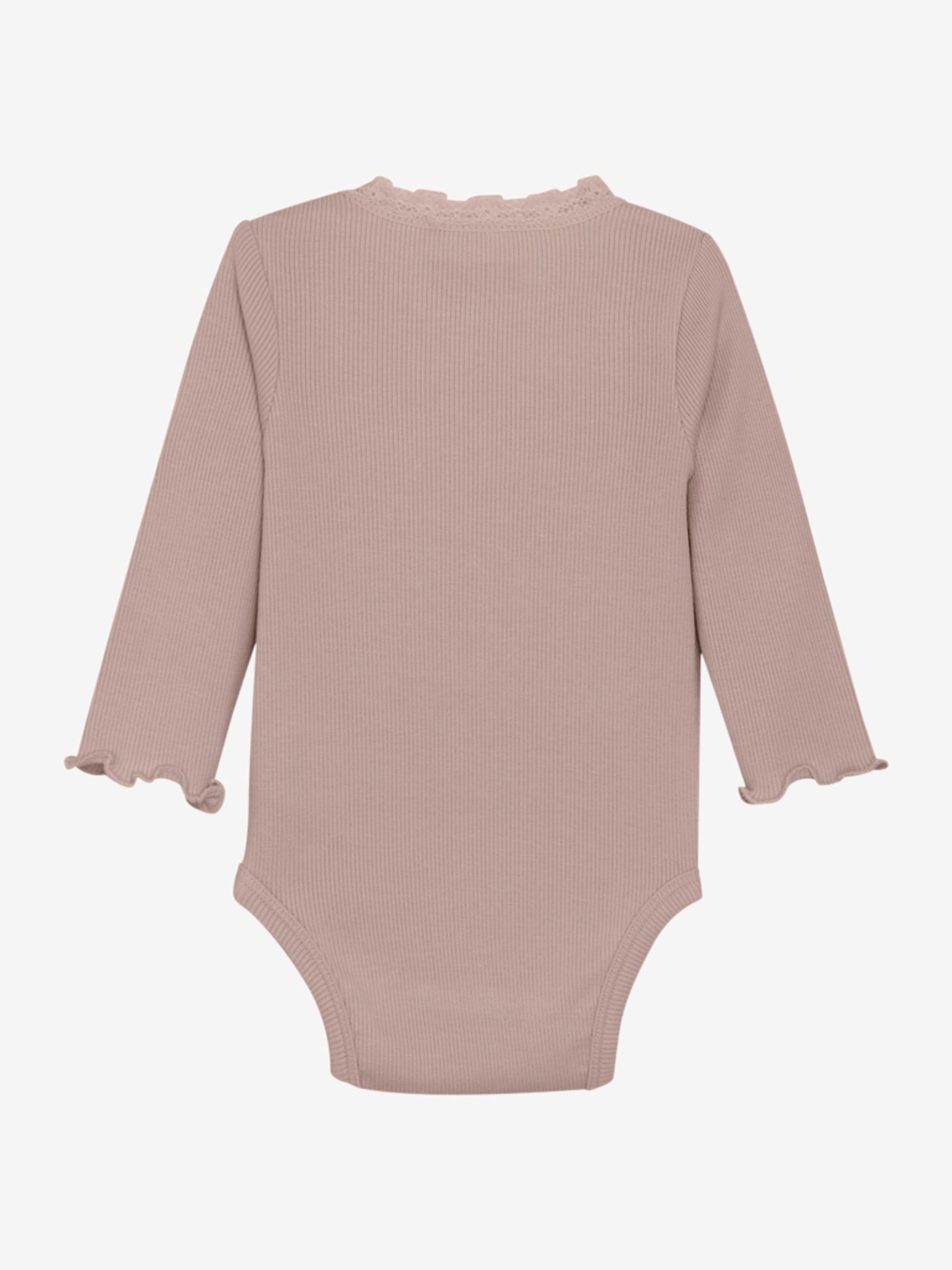 Effenkleurige bodysuit van Huttelihut met kanten rand in de nekopening. Het heeft lange mouwen met fijne golvende randen in de mouwopening. Het opent met praktische drukknopen op de linkerschouder en tussen de benen. Het lichaam is in een zachte modale kwaliteit. Dit product bevat TENCEL™-vezels. TENCEL™ is een handelsmerk van Lenzing AG