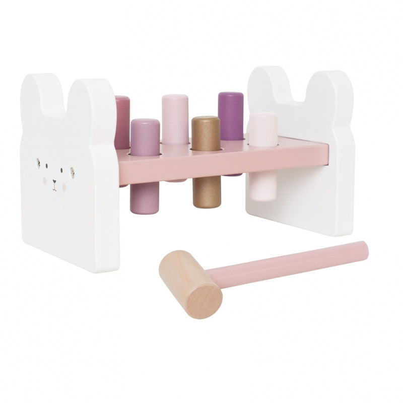 Hamerbank in zachte kleuren met aan de korte zijde een figuur van een konijn. De hamerbank is leuk speelgoed waarmee kinderen hun oog-handcoördinatie trainen. Sla op alle houten bouten met de hamer en als alle bouten helemaal naar beneden zijn, draai je gewoon de hamerbank om en begin je opnieuw.