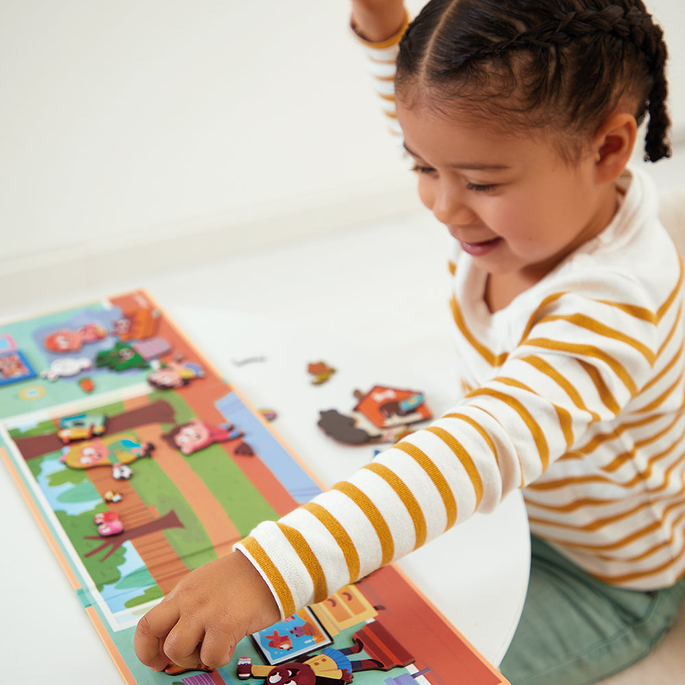 Welkom in dit grote huis, gevuld met dieren waarvoor je moet zorgen en die alleen maar willen spelen! Je moet spelen met de bal met de hond, de vissen voeren en de hamster niet uit het zicht verliezen die er dol op is om zich in schoenen te verstoppen! Met het groot magnetisch decor en de 30 magneten geeft uw kind alles wat nodig is om de grootste verhalen te verzinnen. Magnetisch speelgoed van FSCTM-karton. Speelgoed voor kinderen vanaf 3 jaar. Afmeting 18×18 cm.