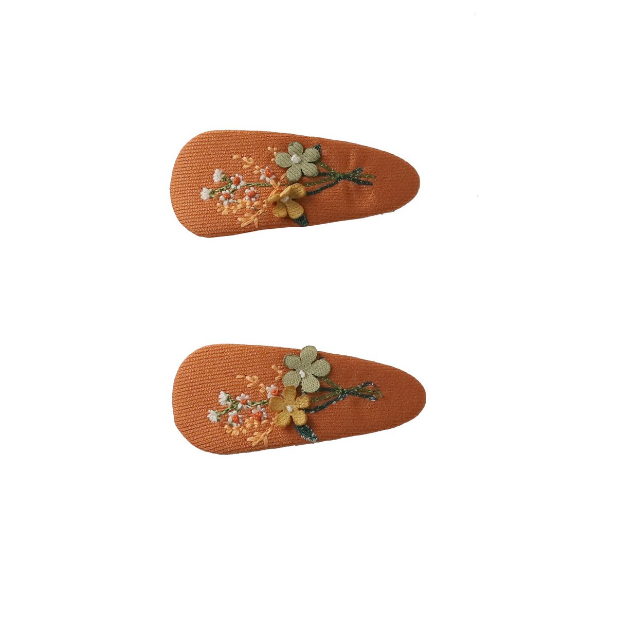 Onze Mildred-haarspeldset is een eerbetoon aan vervlogen tijden. Het bovenste deel van de sluiting is volledig ingebed in zachte stof met betoverend nostalgisch bloemenborduurwerk.