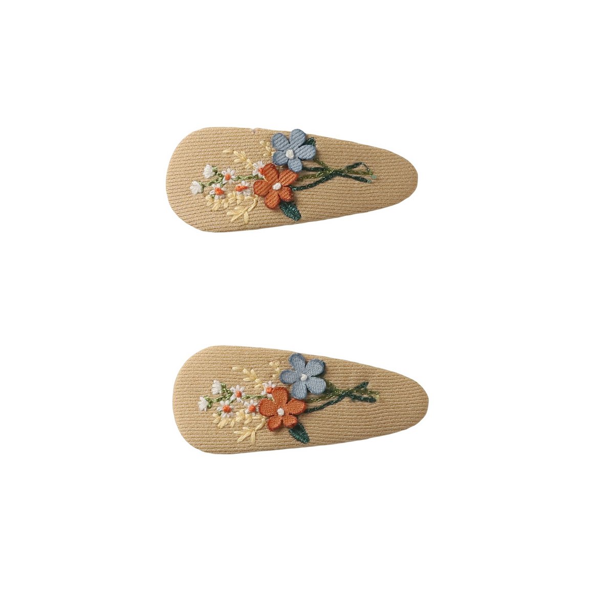 Onze Mildred-haarspeldset is een eerbetoon aan vervlogen tijden. Het bovenste deel van de sluiting is volledig ingebed in zachte stof met betoverend nostalgisch bloemenborduurwerk.