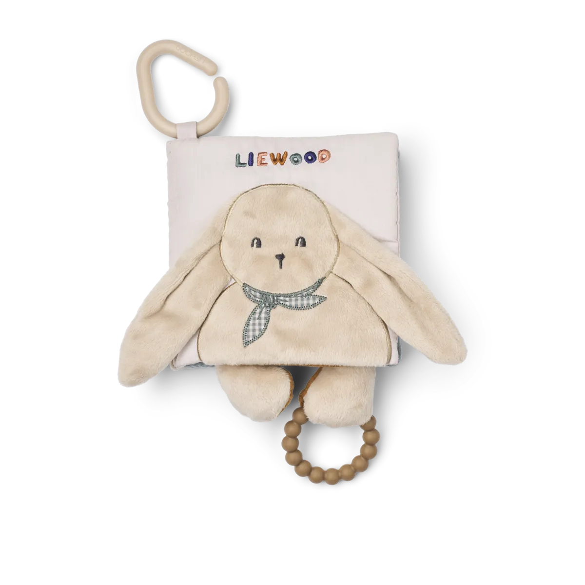 Met voelbare kreukelstof, zachte pluche en andere sensorische elementen moedigt het FEY stoffen boek je kleintje aan om alle verschillende vormen en texturen te ontdekken. De siliconen bevestigingsring maakt het ideaal om mee te nemen in de kinderwagen als een leuk activiteitenboekje.