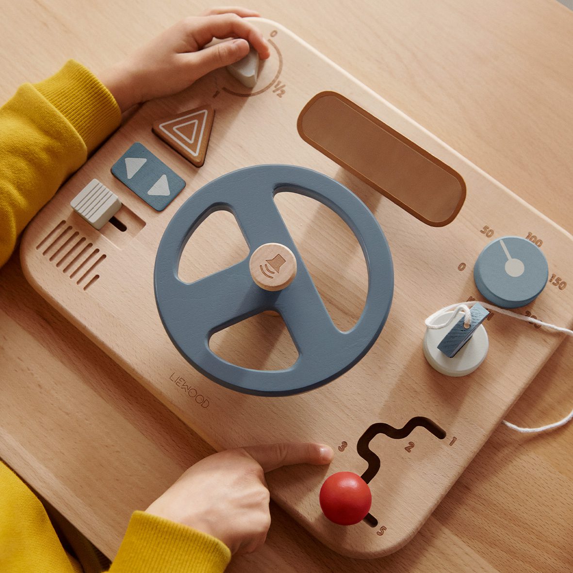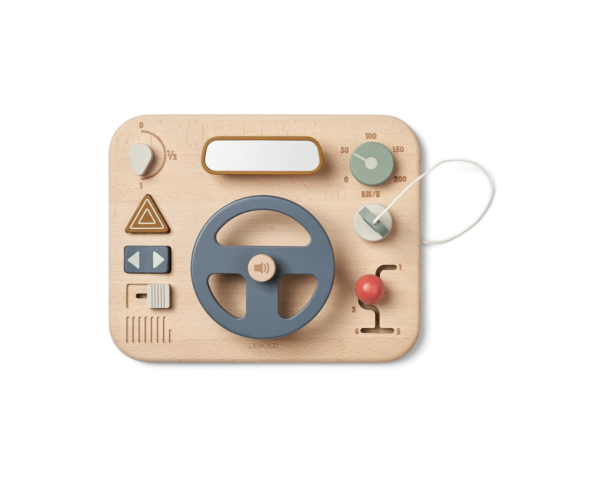 Gemaakt van 100% beukenhout, biedt het diverse activiteiten voor educatief speelplezier. Het beschikt over een versnellingspook, een sleutel die draait als een echte sleutel, een spiegel (met een realistisch spiegeleffect), een claxon met geluid, een stuurwiel en vele interactieve knoppen.