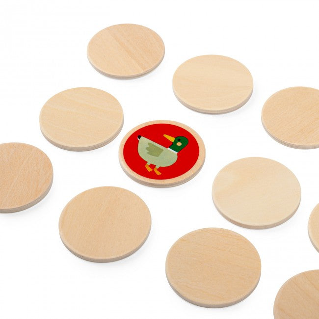 Houten memoryspel met tuinthema. Leg de ronde kaarten met de afbeelding naar beneden en draai er 2 om. Als de kaarten perfect bij elkaar passen, bewaar ze dan. Zo niet, leg ze dan terug. Onthoud hun posities om paren te vormen. Win door de meeste paren te maken. + 2 jaar