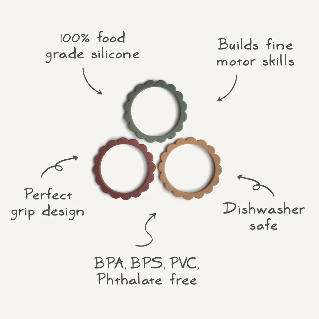 Help het geïrriteerde tandvlees van uw baby te kalmeren met onze lijn bijtringen. Onze bijtringen zijn gemaakt van 100% niet-giftige siliconen van voedingskwaliteit en ontworpen om gemakkelijk vast te pakken met kleine vingers. Ze zijn veilig voor je baby om te gebruiken. Door hun verfijnde kleuren en speelse design zijn ze een stijlvolle toevoeging aan je huis.