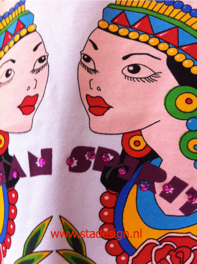 - DESCRIPTION: Short sleeve t-shirt, positional print and ornamental strass.