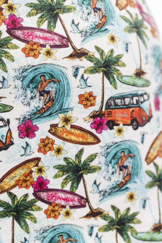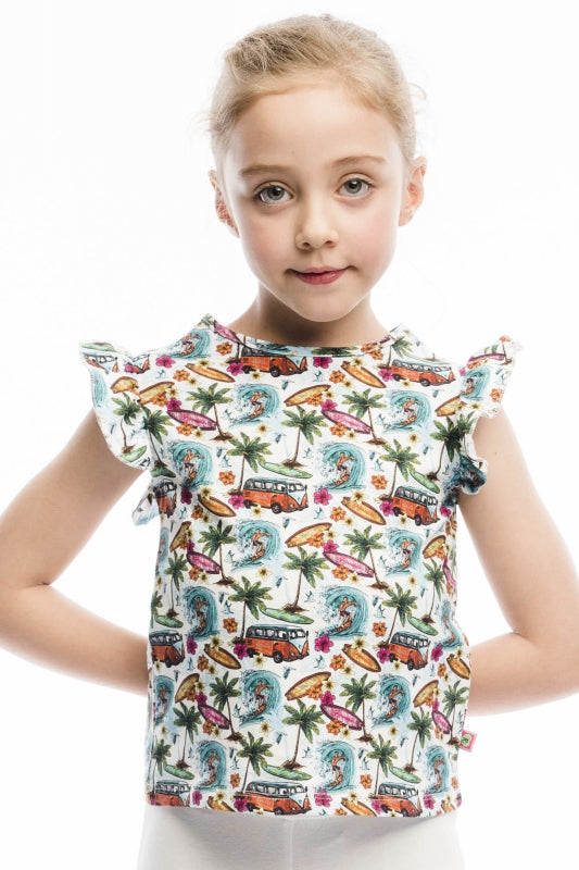 - Description: Elastic single jersey t-shirt with shoulder ruffles it has a surf motives printing