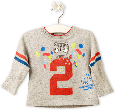 T-shirt lange mouw grijs melee met lurex glitter detail in hals en sportieve print met kat uit de sport team collectie van Tuctuc 90% katoen 10 % linnen